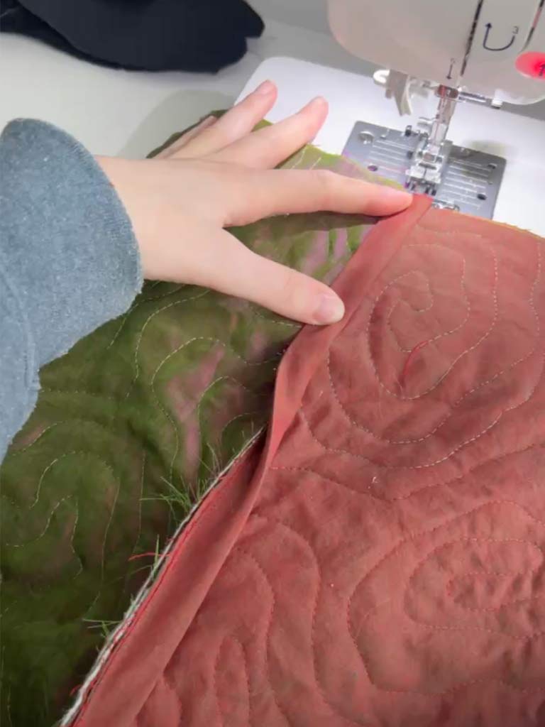 I wanted to use this sort of stiff sari silk in a way that made it wearable but showcased its iridescence. Quilting it in this topographic pattern really helped that shine, and its ok for a quilted garment to be more structured. The barrel shape of the kite pants compliments this stiffness, maybe a little too much they’re a bit clown shaped but I love them.